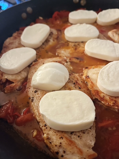 - Add the chicken back to the pan, top each piece of chicken with slices of mozzarella, and transfer to the oven. Bake for 8-10 minutes, or until the cheese is bubbly and the chicken is cooked through (the internal temperature should be 165 degrees). You can also broil on low for a couple of minutes to brown the cheese a bit.