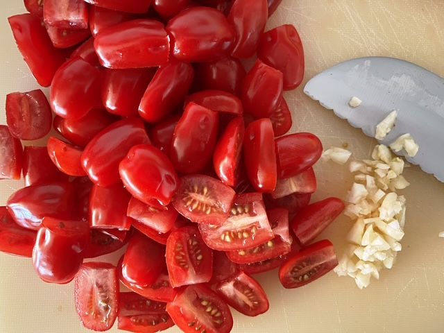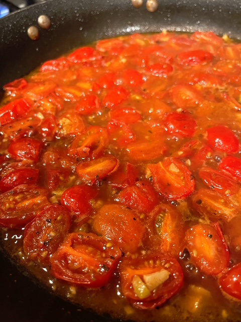 - Add the butter to the skillet, allow to melt, and add the garlic. Cook for one minute and then add the tomatoes. Allow to brown and cook for a couple of minutes and then use the water to deglaze the pan. Reduce the heat to low and allow the sauce to simmer until reduced slightly (taste at this moment and adjust seasonings to your liking).