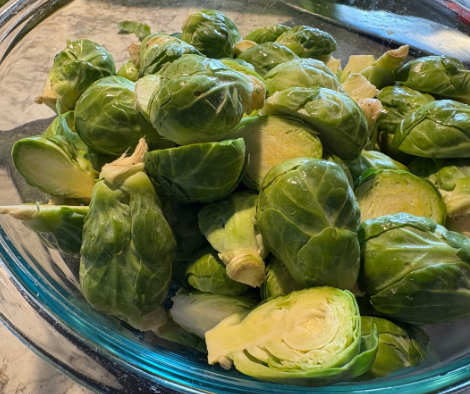 All you have to do is slice them in half length-wise, then toss them in olive oil (about 1 tbsp. per pound of sprouts) and add salt and pepper. You can also add minced garlic if you want to!