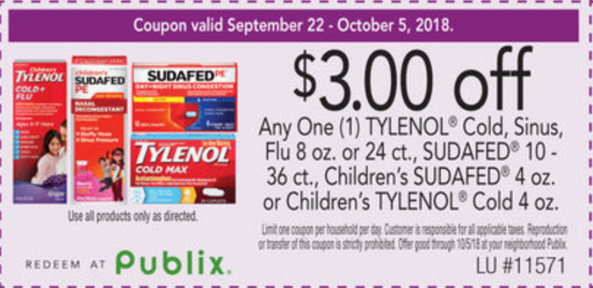 -$3 off Tyelnol Cold, Sinus, Flu 8 oz or 24 ct, Sudafed 10 -36 ct, Childrens Sudafed 4 oz or Childrens Tylenol Limit 1, (Publix Coupon), Health & Beauty Flyer or printable