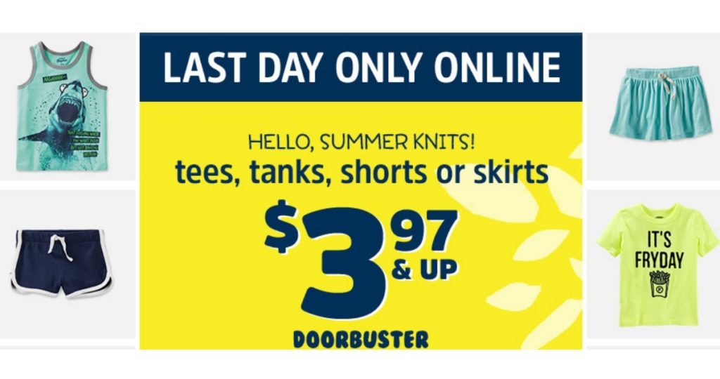 Do the kiddos need some clothes for summer? This is the last day to grab tees, tanks, shorts and skirts starting at $3.97, regularly $18 at Oshkosh. Go ahead and stock up on several outfits at this price!