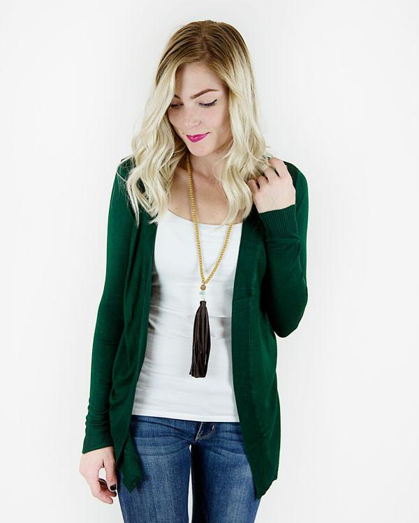 The cardigan is lightweight, has an open front feature and comes in 15+ colors. I personally love the Dusty Coral and the Hunter Green colors…