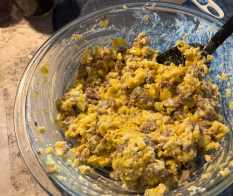 Add the scrambled eggs to the sausage and cream cheese and mix.