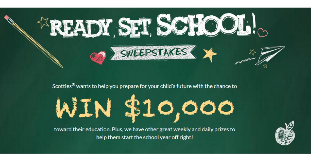 Enter the Scotties Ready Set School Sweepstakes for a chance to win the grand prize of $10,000 cash or one of 24 first prizes of $500 each.