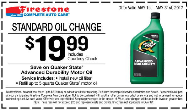 You can print a coupon or text the coupon to your phone for a Standard Oil Change at any Firestone Complete Auto Care for $19.99.