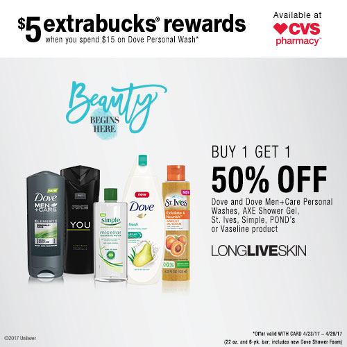 $5 ExtraBucks when you buy $15 of Dove Personal Wash (22 oz & 6 pk. bar; includes new Dove Shower Foam) (valid 4/23/17-4/29/17)