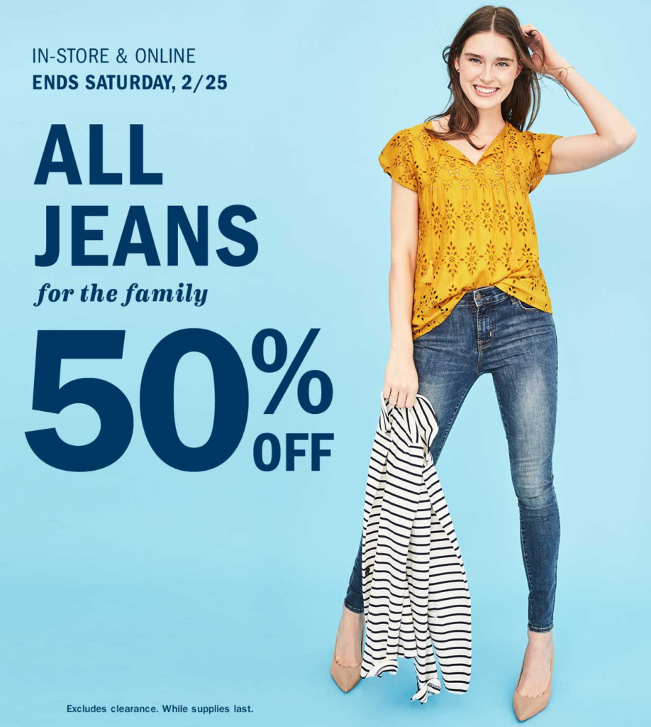 Through Saturday you can still take advantage of 50% off all jeans at Old Navy. This is good for the entire family applying to all jeans across the site and store.