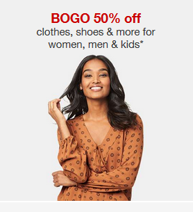Heads up Target shoppers! Through 9/24, you can get B1G1 50% off on select regular priced clothing, shoes and accessories.