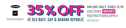 You can get an additional 35% off sitewide at Old Navy, Gap, and Banana Republic when you use coupon code MERRY at checkout thru 11/19.