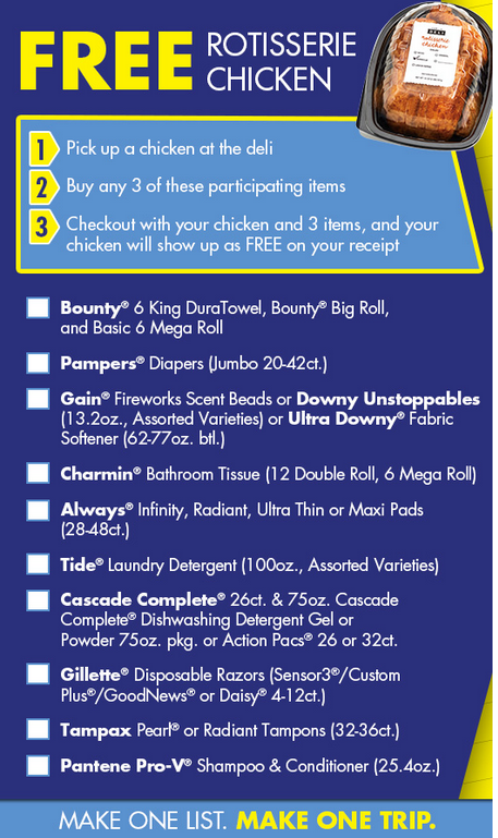 Buy (3) participating P&G products and get a free rotisserie chicken from the deli department. You won’t have to run all around town searching for your household, beauty and health products on top of going to the grocery store. Once you’re finished buying all of that, you have dinner almost completely prepared! Your main course is ready to go and you just need to fix the sides. It’s a great if you’re having a busy week and don’t have time to hit all of your usual stores.