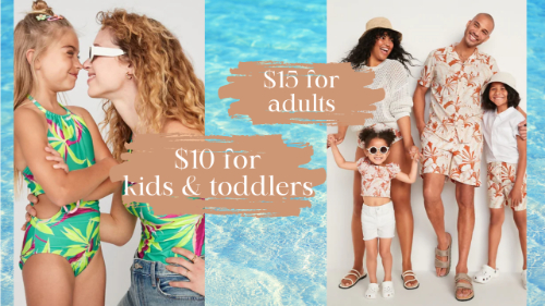 Today only, Old Navy is offering select Swimwear at $15 for Adults & $10 for Kids & Toddlers! What a great time to get a head start on summer gear-up for the whole family! No code necessary; prices as marked.