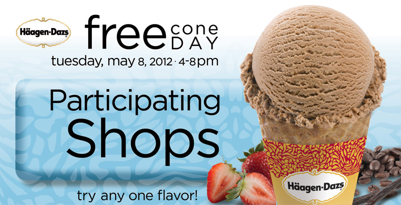 May 8th will be a very good day. Visit any participating Haagen-Dazs location between 4-8 pm on 5/8 to score a free Haagen-Dazs ice cream cone! No purchase is necessary and the Haagen-Dazs Facebook page shows all participating locations.