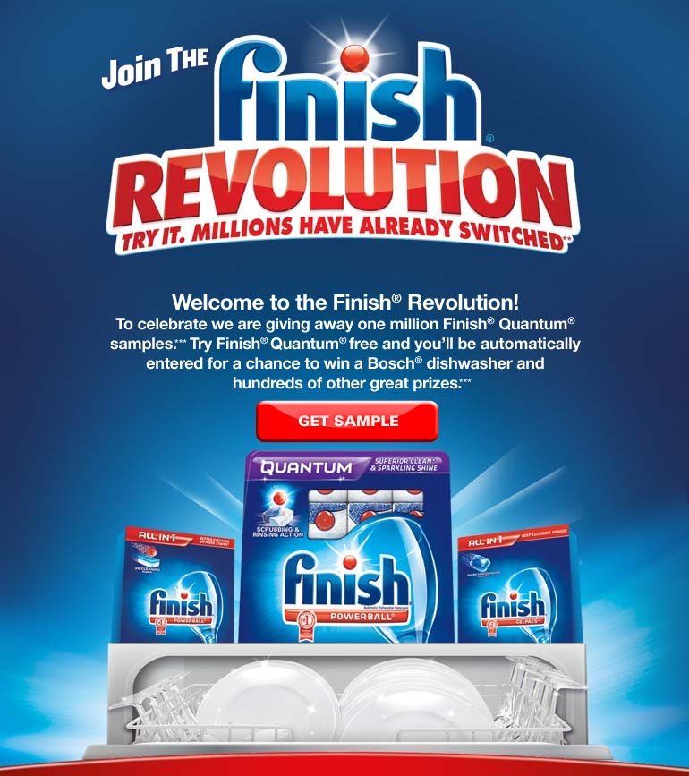 Finish – Free Finish Quantum 2 pack Sample. Available to the 1st million fans. You’ll also be entered to win one of five Bosch Ascenta dishwashers. Invite 3 Friends to get Samples!