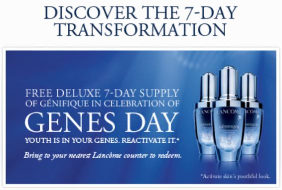 October 21 is Genes Day, and when you visit the Lancôme Facebook page, click “Like” to print a coupon for a FREE 7-day supply of Lancome Genifique.