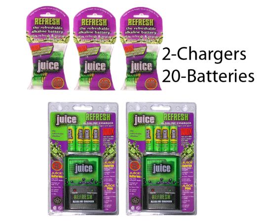 Tired of always having to buy new batteries when they run out of juice? Well Graveyard Mall is offering a deal on Juice Rechargeable batteries. You get 20 Alkaline batteries (16 AA and 4 AAA) and 2 refresh chargers for $9.99. Shipping is $6.99 making this $16.98 total.
