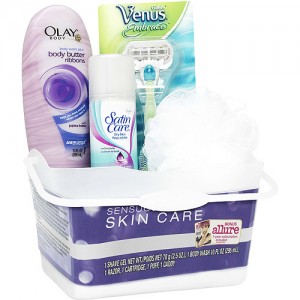 There are two different sets to choose from. Both include an Olay body wash, Venus razor, and bath puff. One includes Satin Care shave gel and the other includes Secret body spray. Both come in a reusable shower caddy.
