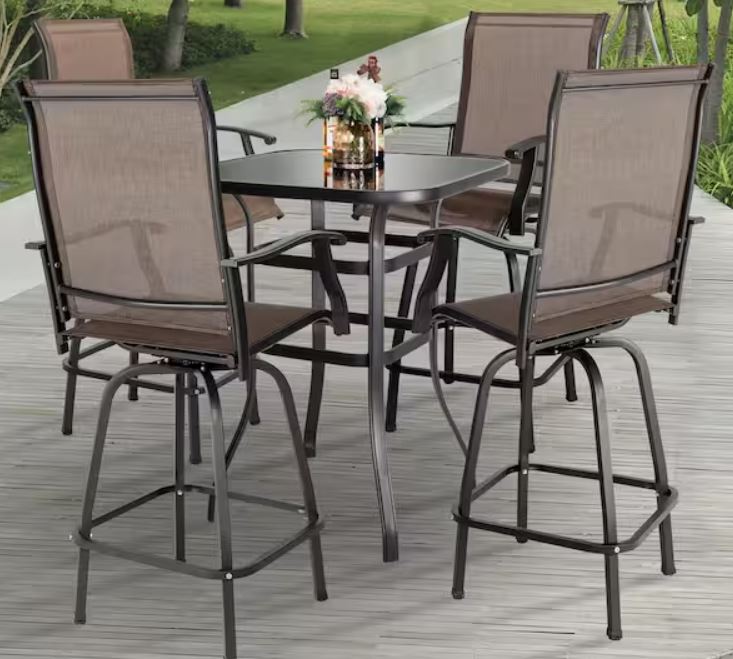 5-Piece Metal Patio Outdoor Bar Set with High Swivel Bistro Chairs and Square Table – $329 (reg. $548.99)