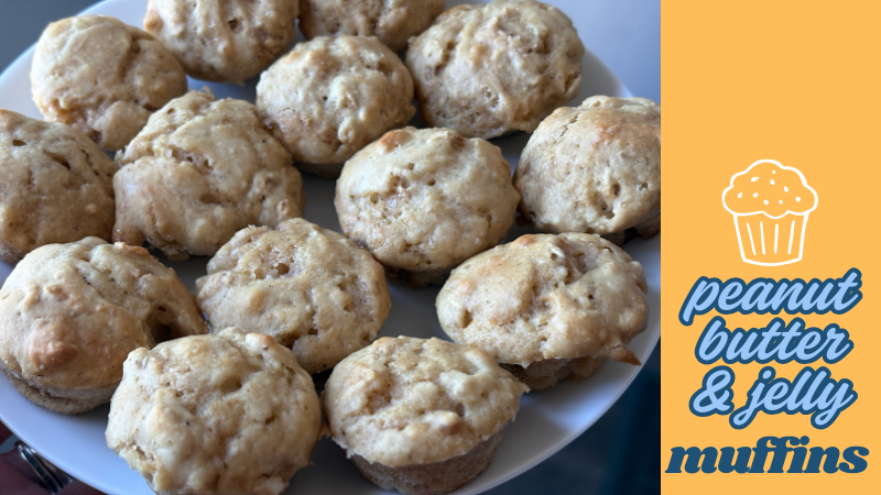 I was in the mood to make a snack for the kids, but the pantry was a little bare. I looked through the fridge for inspiration and saw a jar of peach apple jam a neighbor had made and canned and given to us. Then I thought about peanut butter, and wondered if it was possible to turn a peanut butter and jelly sandwich into a muffin. I figured it was worth a try! These peanut butter and jelly muffins aren’t overly sweet, but they are moist and nutty and my kids gobbled them up.