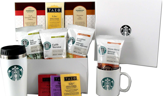 The set includes: 18 oz. Starbucks Ceramic mug, Starbucks Tumbler, Assorted Starbucks Selects cookies (Choc Chip and Triple Choc Bliss!), four bags of assorted flavors of Starbucks coffee, twenty four servings of assorted Tazo Teas packed in a Starbucks gift box with a personalized message card!