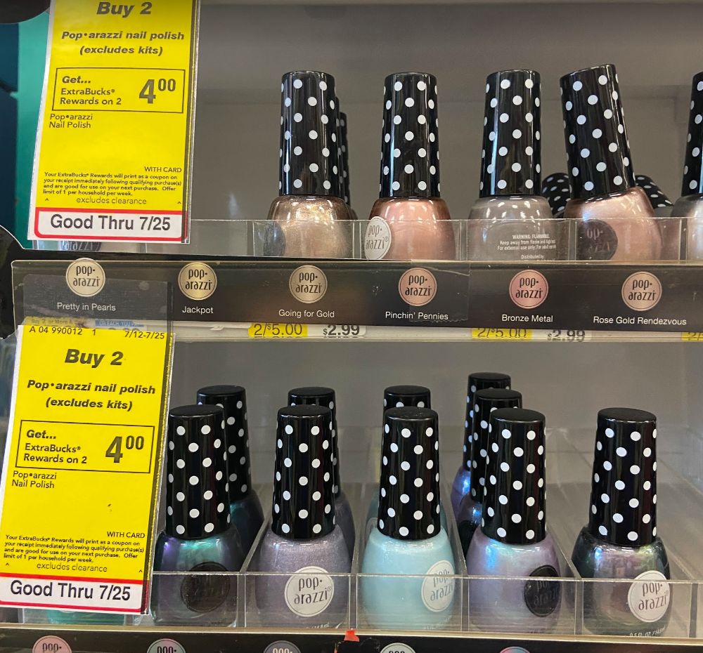 Get $4 Extra Care Bucks when you buy two Pop-arazzi nail cosmetics. They are regularly priced two for $5. So with no coupons needed you’ll get them for 50¢ each after rewards.
