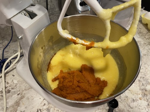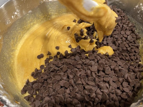 One of the best parts of the recipe, it uses a whole can of pumpkin puree instead of 1 cup. While I could always freeze whatever is left, I’d much rather just use up the whole can in one go and freeze whatever I make with it—which, in this case, is the extra pumpkin chocolate chip cake.