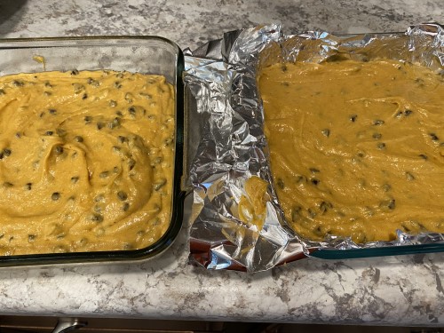Preheat the oven to 350 degrees. Grease two 8×8 or 9×9 pans with cooking spray.