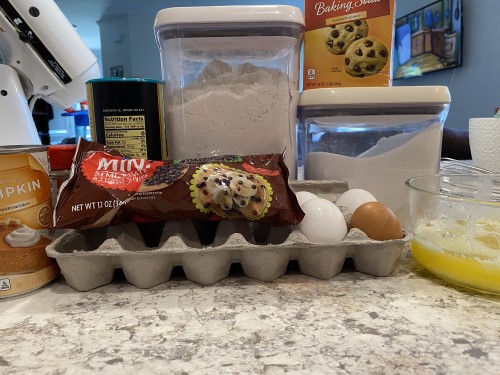 Here’s everything you’ll need: butter, pumpkin, eggs, sugar, flour, baking soda, salt, cinnamon, and chocolate chips.