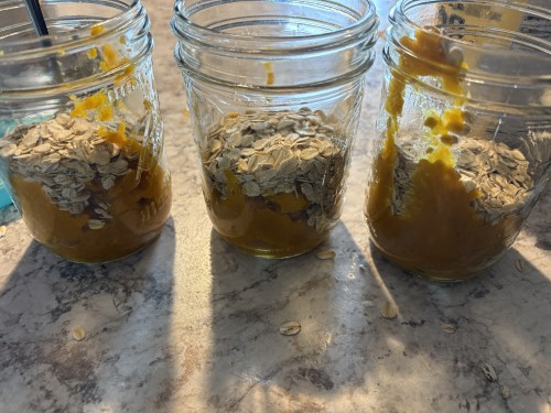 I made three jars at once. This used up one jar of pumpkin. I put 1/2 cup pumpkin and 1/2 cup rolled oats in each jar.