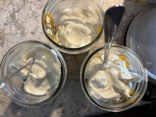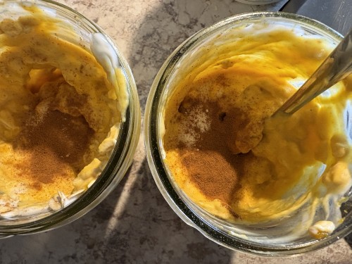 - To each jar, add the following: 1/2 cup canned pumpkin, 1/2 cup oats, and 1/2 cup yogurt.