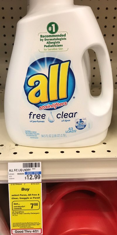 The best price is on Purex. Grab the 150 oz bottle for $10.99 and after the rewards back (and a coupon you might as well use) you’ll pay $3.49 for a huge bottle of detergent!