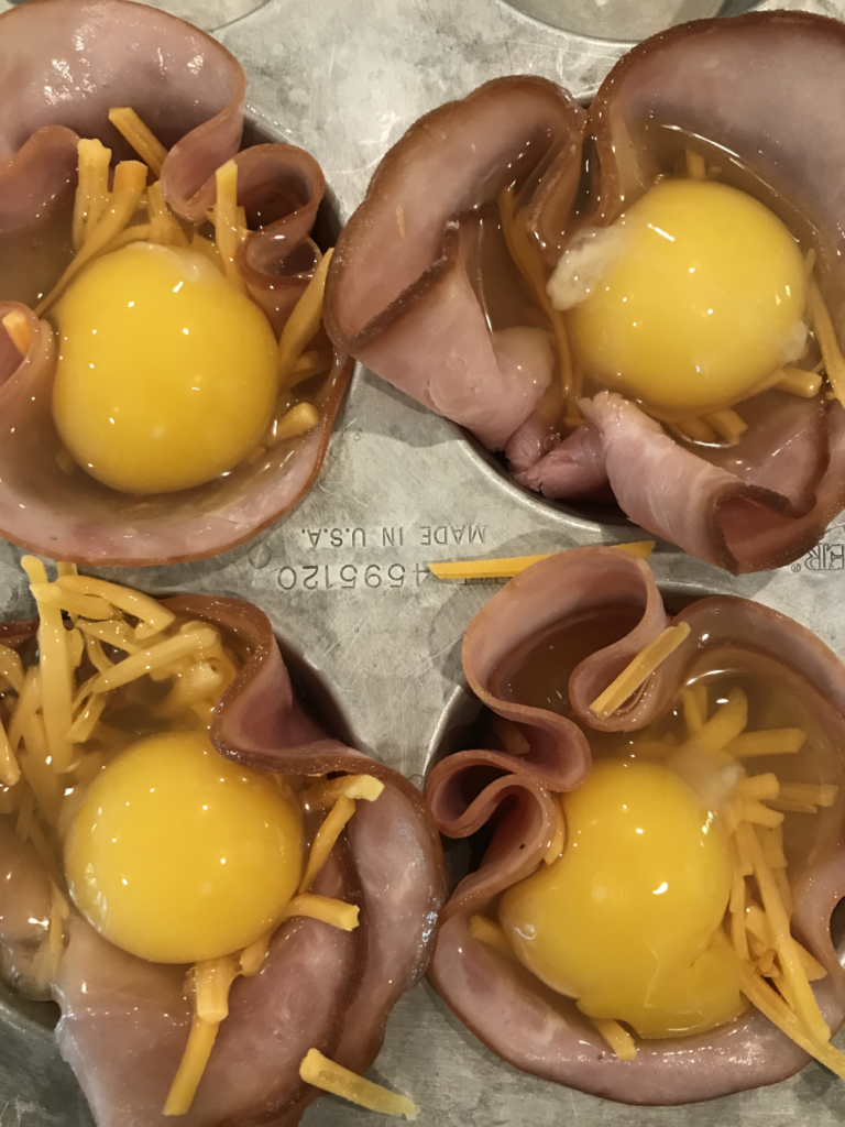 - Put two pieces of thinly sliced ham in the bottom of each cup, making a muffin liner out of it.