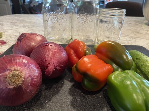 I used a variety of vegetables from the store and garden. The onions are from the store, and the peppers and cucumber are from our garden.