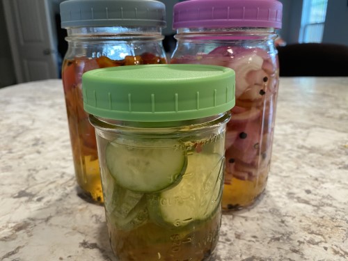 We are already getting cucumbers from our garden, so I’m remembering back to last summer when I tried to make quick pickled vegetables for the first time. I don’t love raw cucumbers, but I absolutely love pickles. I also experimented with pickling onions and peppers, and the experiment did not disappoint. This recipe is for a small batch, but if you have lots of vegetables, just double or triple the pickling liquid.