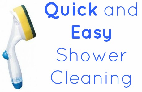 The most simple way is to keep a Scotch Brite dishwand in the shower filled with ½ vinegar and ½ dishwashing detergent. They sell something similar at the Dollar Tree. This is a great cleaning product alternative that is easy and convenient!