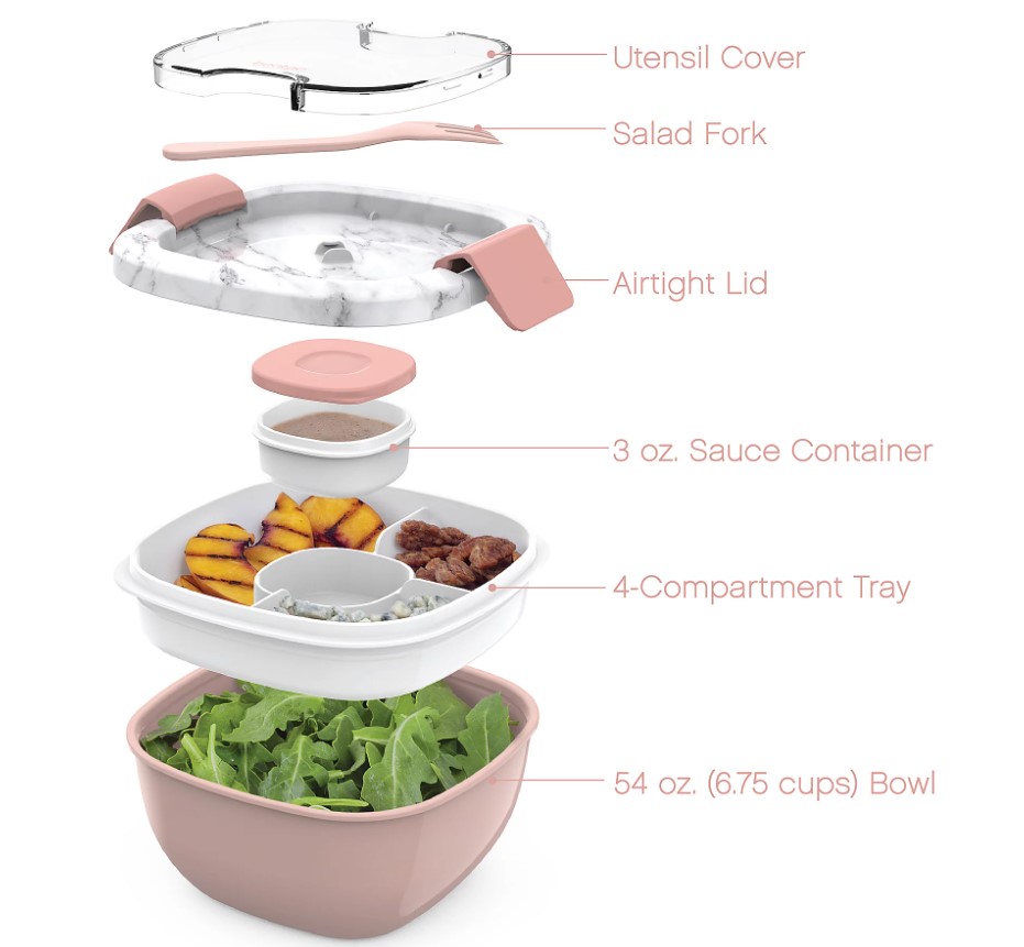 Each container keeps your favorite greens at the bottom and your dressings (and toppings) at the top. Features rubberized sealing rings and locking clips.Includes a 3-oz dressing container and even include a fork!