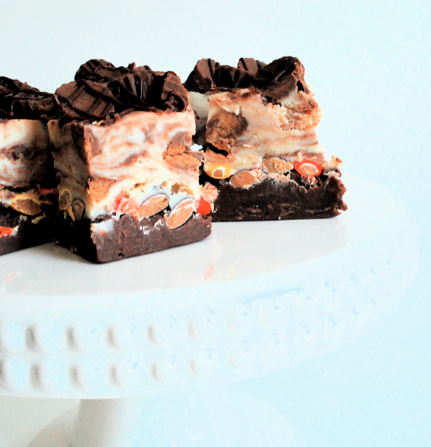 - Pour the fudge on top of the milk chocolate layer already in the 8×8 pan. Sprinkle the Reese’s Minis on top and press gently.