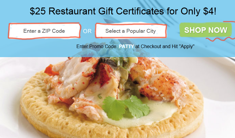 Restaurant.com has a deal on their $25 certificates for $4 with coupon code PATTY at checkout.