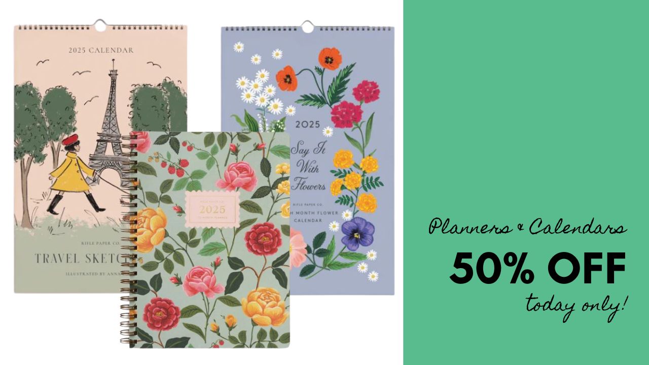 Rifle Paper is offering 50% off planners and calendars today only as part of their 7 days of deals. Don’t miss out on these beautiful prints that you’ll be able to look at all year next year!