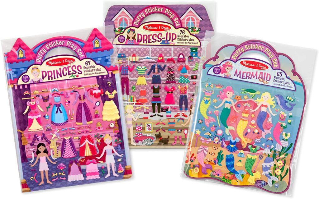 These little coloring pads are great for the car since they can fit in a child’s lap. My girls have always loved these reusable sticker books. The puffy stickers are easy for little hands to manipulate.