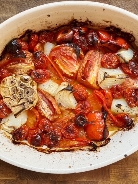 What makes it so good is the soup base you make by roasting tomatoes and red peppers, bringing out their natural sweetness.