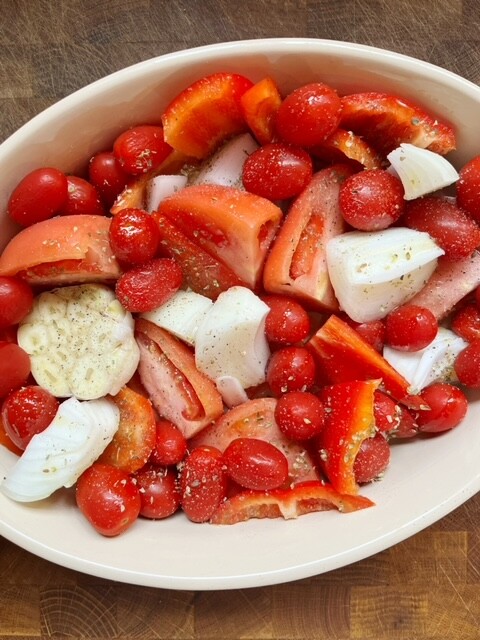 - In a large baking dish, add both kinds of tomatoes, bell pepper, garlic, and onion. Sprinkle with salt and pepper, oregano, and drizzle with olive oil.
