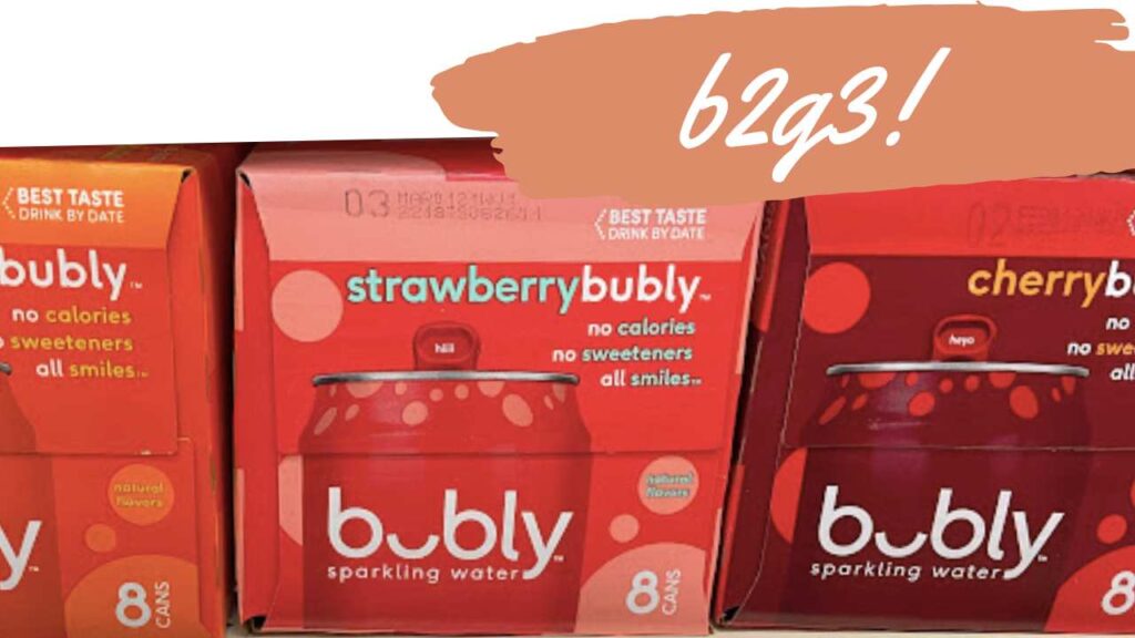 - Bubly Sparkling Water, selected, 8 pk 12 oz cans, B2G3FREE at $5.99, limit 5