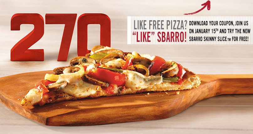 You can get a FREE slice of Sbarro pizza Tuesday, 1/15. Your free slice will be a piece of their new Skinny Pizza.  Head over and request your coupon now, and then enjoy your free lunch or dinner next Tuesday!