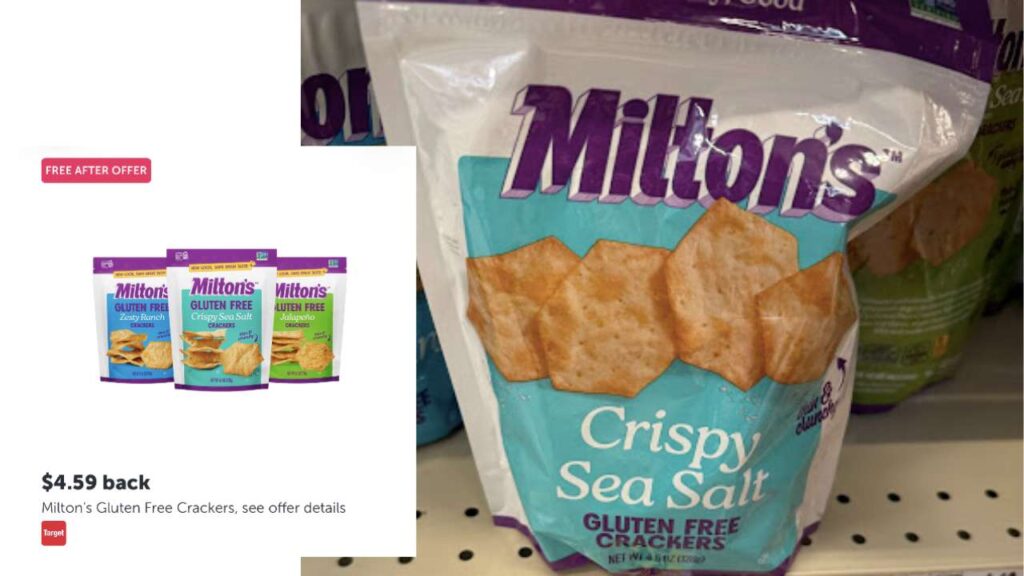 Are you gluten-free? For a limited time you can grab a FREE bag of Milton’s Gluten-Free Crackers at Target using the Ibotta app! Add it to your shopping list for an easy freebie.