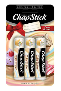 | Purchase Information:ChapStick® Cake Batter will be available beginning November 1st at Walmart, Target, CVS, Rite Aid and select food and convenience stores in a three-count holiday pack. | |