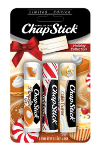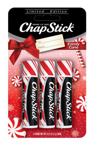 | Purchase Information: ChapStick® Candy Cane will be available beginning November 1st at Walmart, CVS, Walgreens, Rite Aid and select food and convenience stores in one-count loose sticks for an SRP of $1.00. A three-count holiday pack will be available at Walmart, Target, CVS and select food and convenience stores. | |