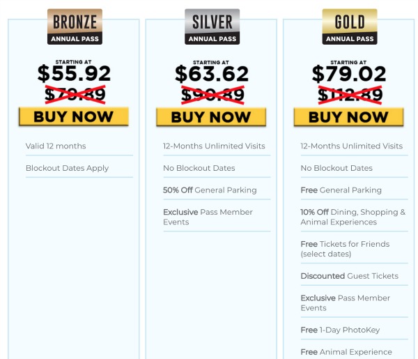 The best deal is to get a Gold annual pass that comes with free parking all year, a free animal experience, and guest passes for $79 (reg. $113).