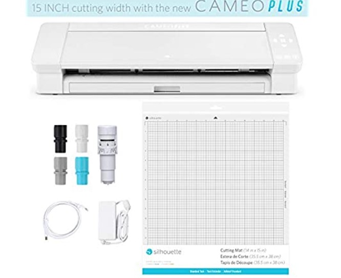 The Silhouette Cameo Plus is a larger version of the Cameo 4 desktop cutting machine. It can accommodate material widths of up to 15 inches and lets you make precision cuts in vinyl, cardstock, fabric, and more.