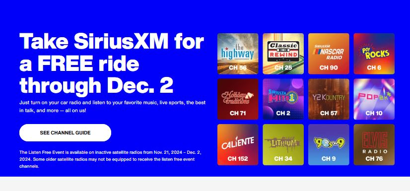 The Listen Free Event is available on inactive satellite radios from now through Dec. 2, 2024. Some older satellite radios may not be equipped to receive the listen free event channels.
