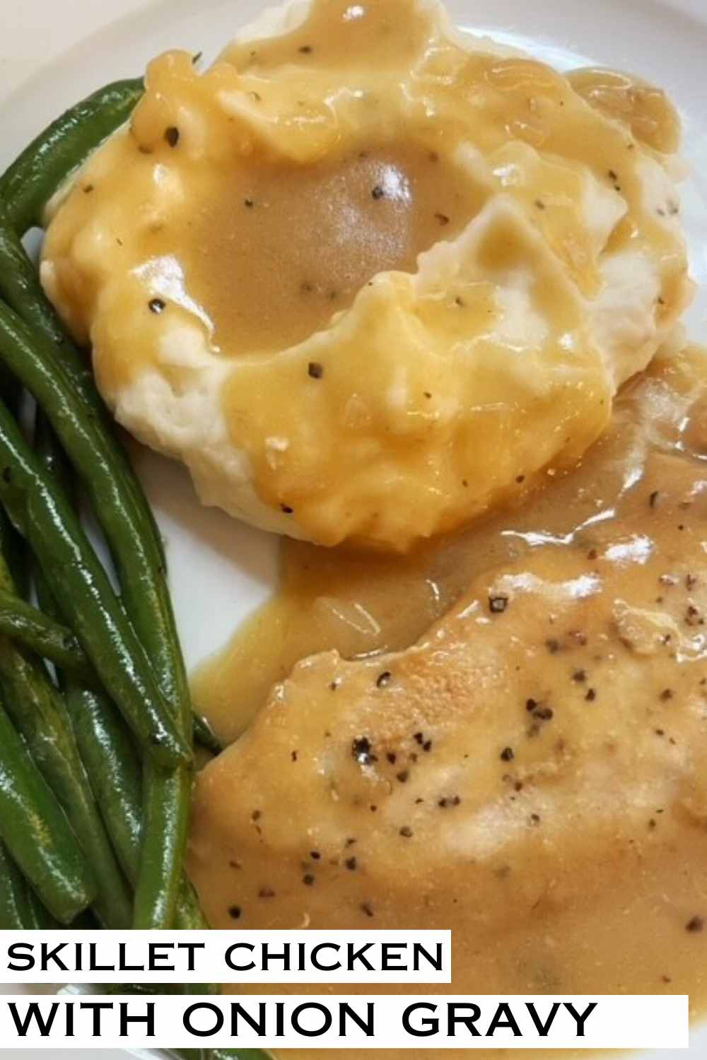This skillet chicken with onion gravy has a comforting homemade taste and feel. It’s quick to make, but it tastes like it’s been cooking all day!